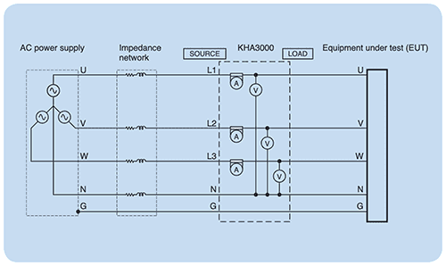 KHA Series are equipped with a function to measure the voltage, frequency, peak voltage and distortion rate of the AC power used for harmonic compliance testing in order to check whether or not the power supply is adequate for the intended test.