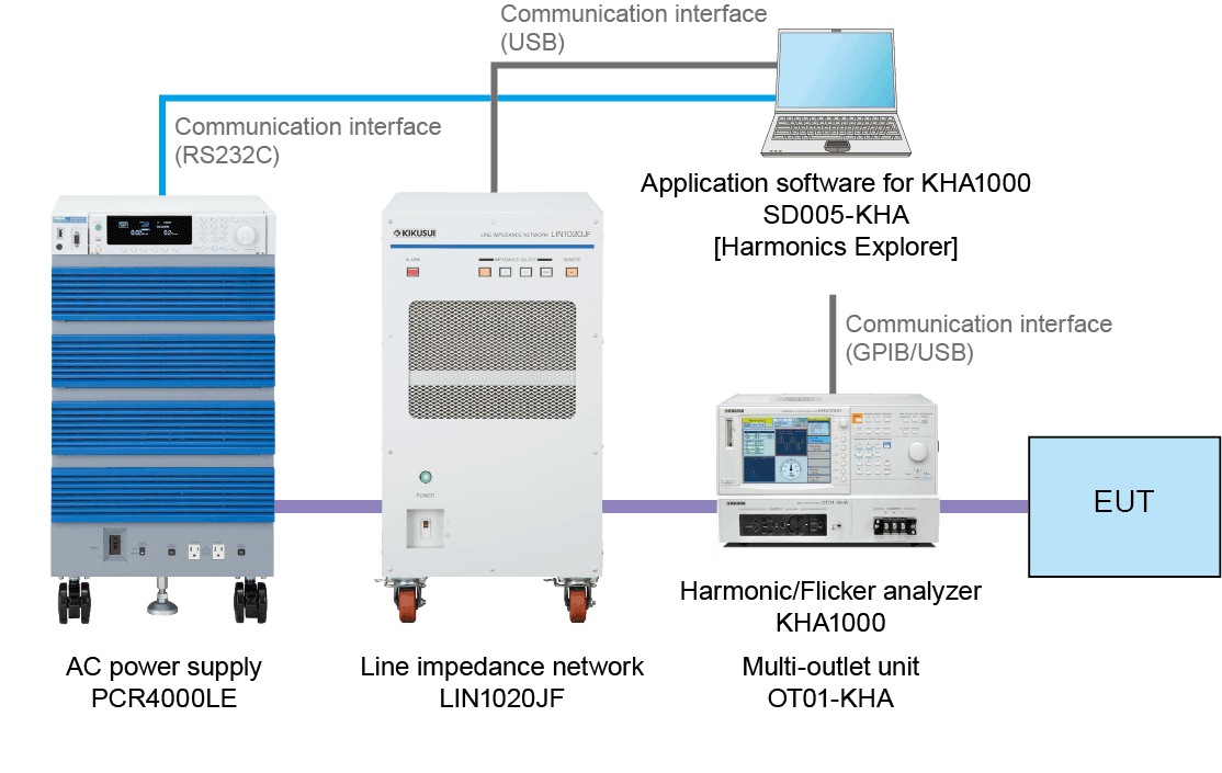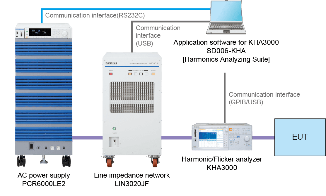Using this device alone, you can perform a series of test processes from setting test conditions and running the test to judging test results against limit values and outputting result reports – without the use of a PC. The device displays pass/fail results and spectrum data on the screen in real time. What’s more, since KIKUSUI’s PCR-LE/LE2 Series AC power supply can be controlled from KHA Series, you can set up an easy-to-use test system whereby the operation panel of this device can be used as the main console.