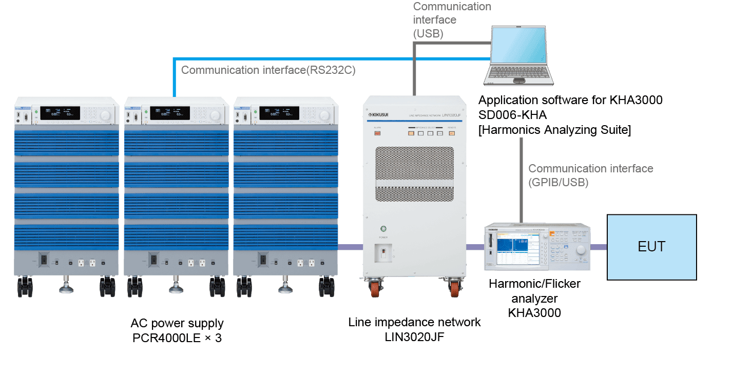 KHA3000, in addition to the complied standards and features of the KHA1000 (dedicated for single phase), is equipped for the harmonic and flicker compliance tests exceeding 16 A of the single-phase and three-phase equipment. With this unit alone, you can take highly accurate simultaneous three-phase measurements up to 40 A/phase*1. Furthermore, the KHA series is compliant with three measurement technique standards, the existing and the latest versions, so you can simply select to take measurements for the latest standard including interharmonics and for the conventional integral multiple harmonics without using any other device. It is possible to acquire the pass/fail judgment by using the KHA to conduct the onsite testing as per*2 near by the large device, accordingly it can save the significant amount of time that applies to the standard compliant test. Of course, it supports the measurement of the single-phase device and for the standard compliance testing below 16A. In addition to the real-time display that can be used like an oscilloscope and FFT analyzer, the unit offers the real-time judgment of compliance with standards. Using this unit alone, you can judge test results and prepare result reports without the use of a PC. On top of that, you can easily set up a test system by combining KHA3000 with an AC power supply (PCR-LE Series) and a line impedance network (LIN3020JF).