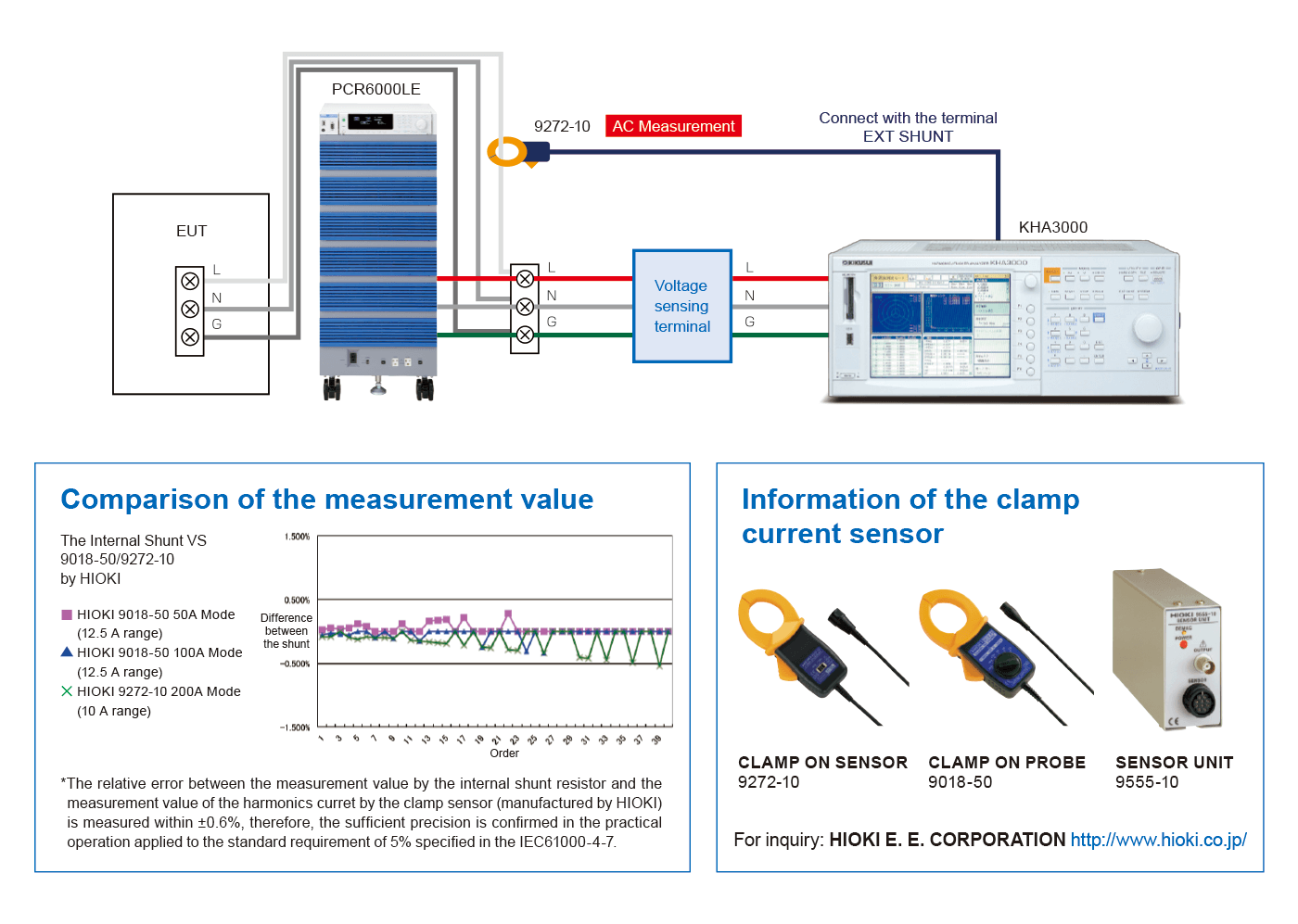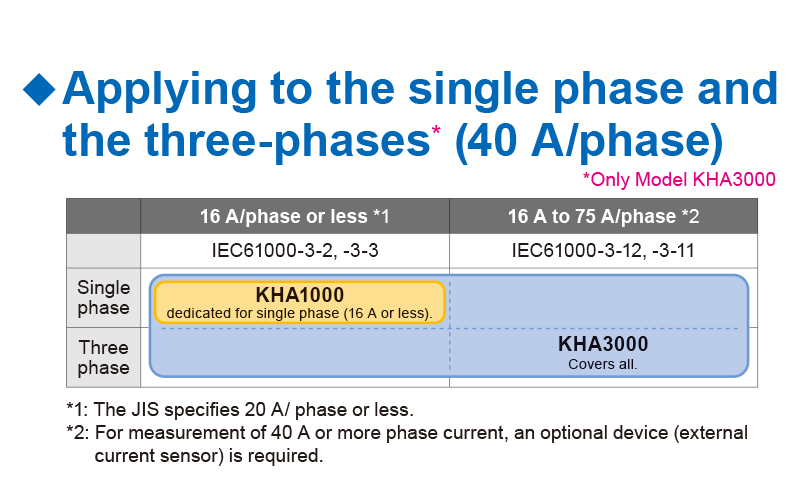 *1: Measurement beyond 40 A/phase can be supported by firmware ver.2.00 or later of KHA3000,and clamp-on probe on shelves. *2: It is required to use the application software “SD006-KHA” (“SD005-KHA” for the model KHA1000) when you wish to generate the report of the waveform verification for the “Class C equipment” (lighting equipments) complied to the IEC6100-3-2Ed4.0.